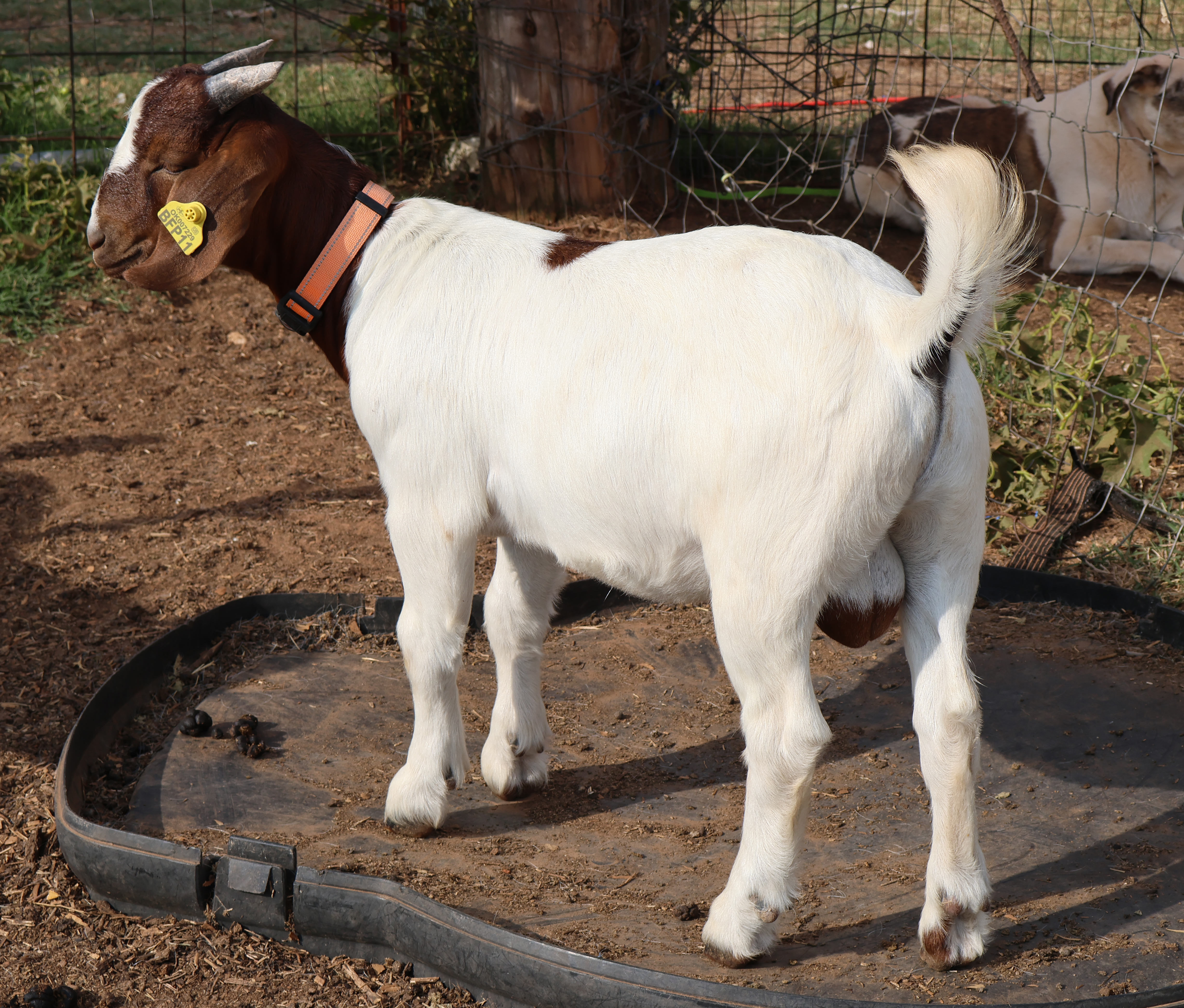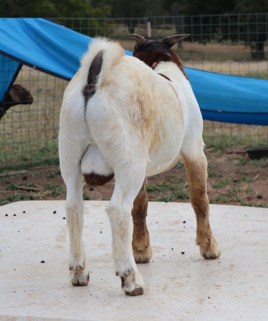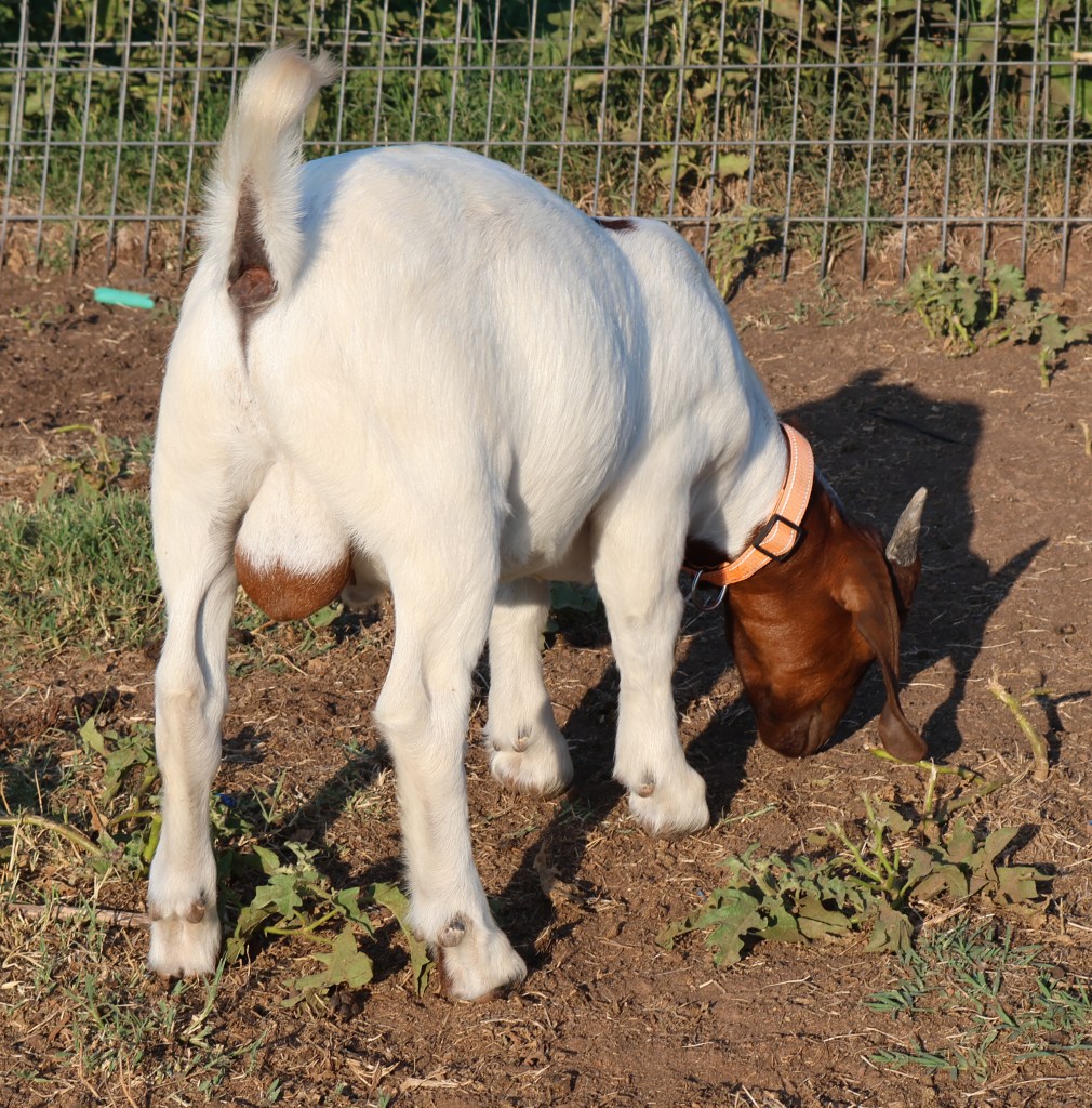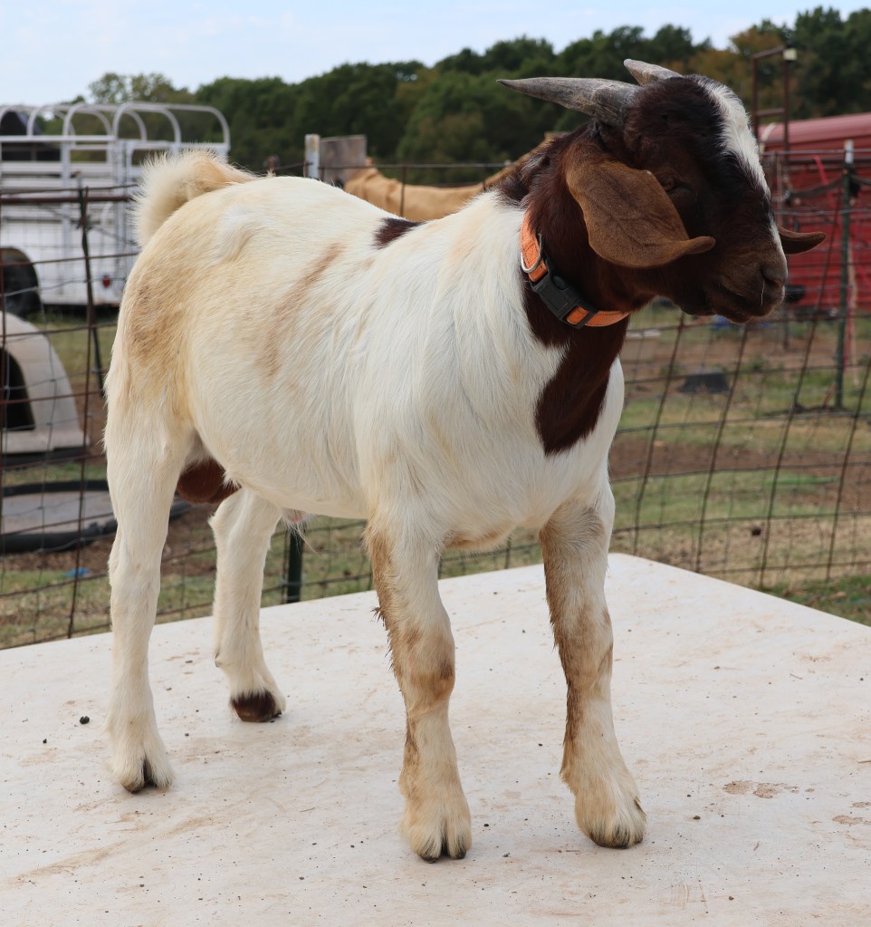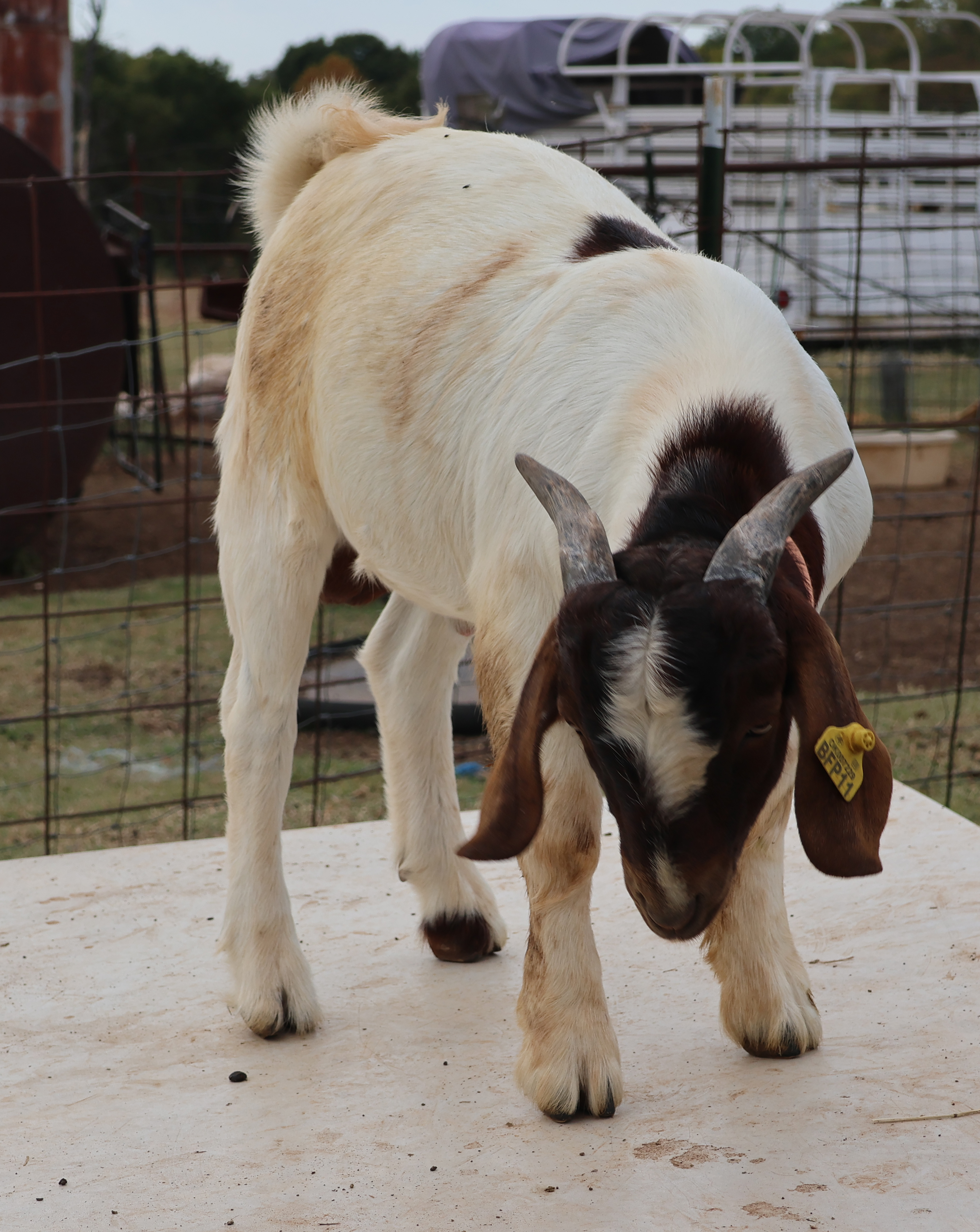 You won’t find a wether-bred buck for a more reasonable price. Schroeder was born April 6, 2024, and is out of a son of Kester-bred Hot Wheels (a son of Draggin’ Main), who has produced numerous champions for Irick Show Goats. Up-to-date on vaccinations. Schroeder’s estimated weight (via tape) on 10/7 was 84 lbs. Traditional color. Pigmented scrotum! Located northeast of Ada between Francis and Allen. Must pick up on the farm.