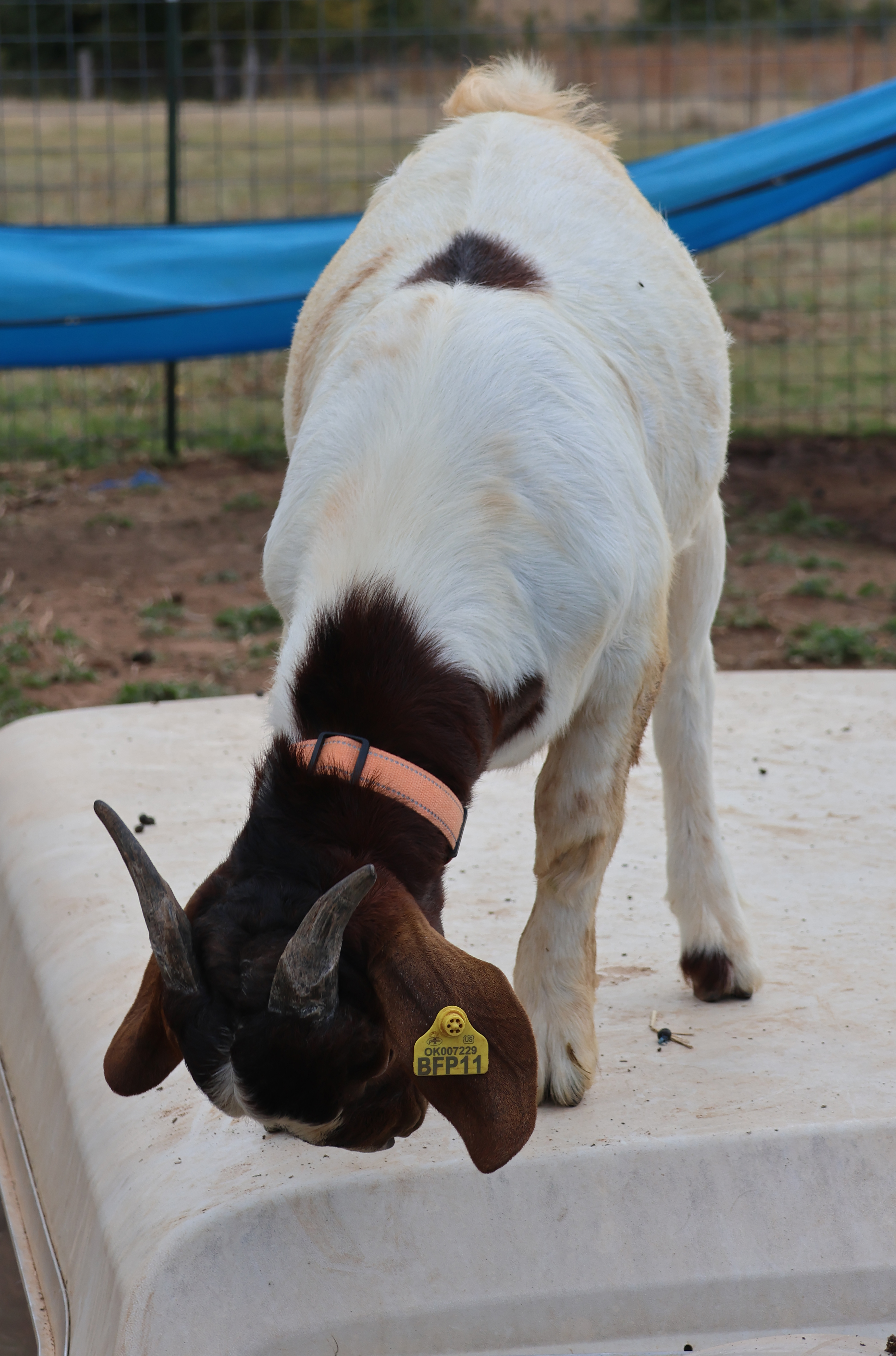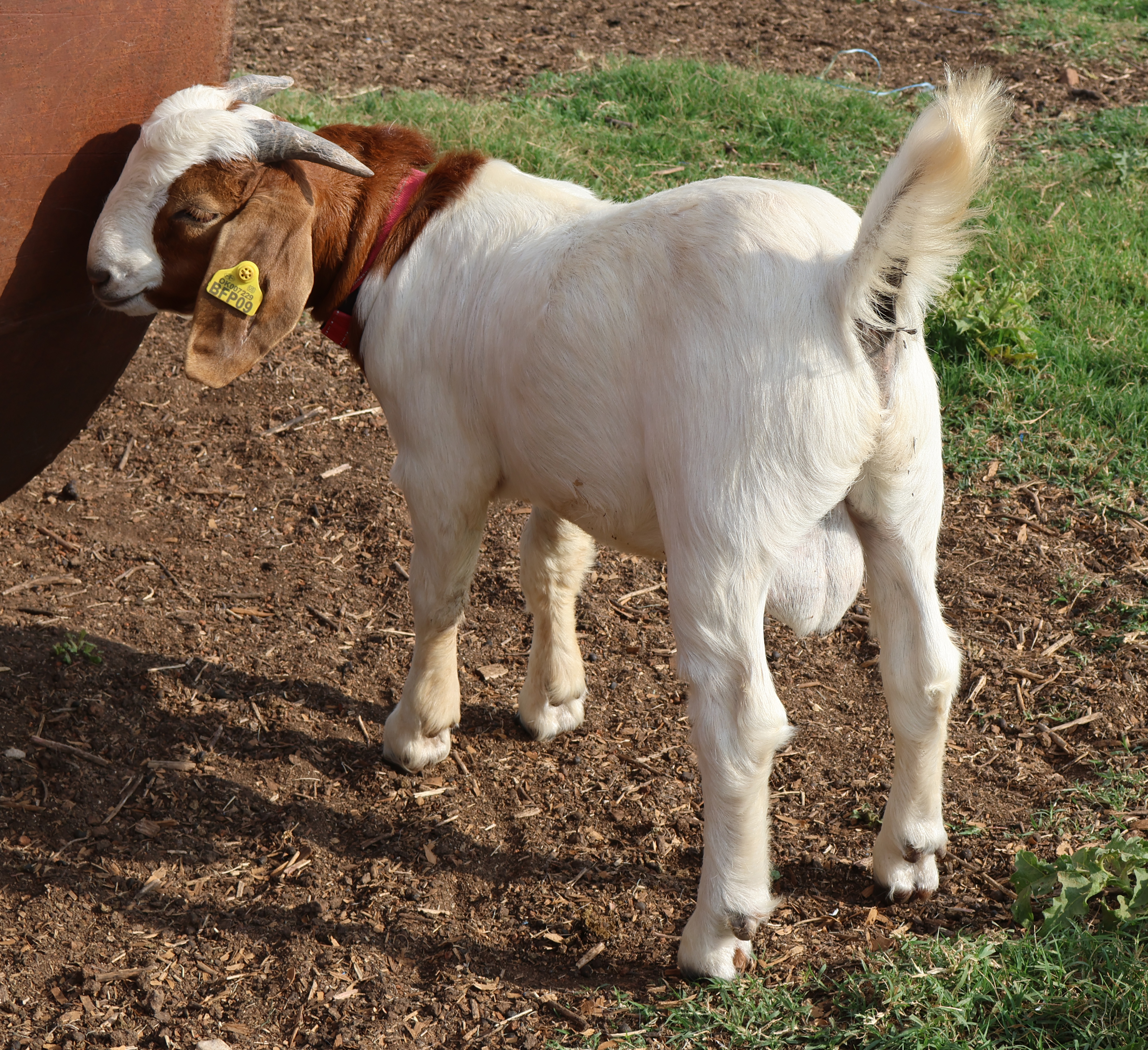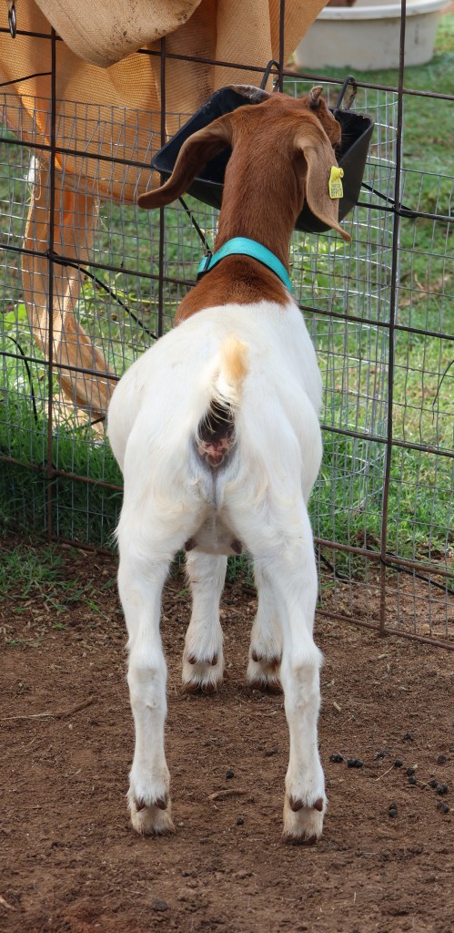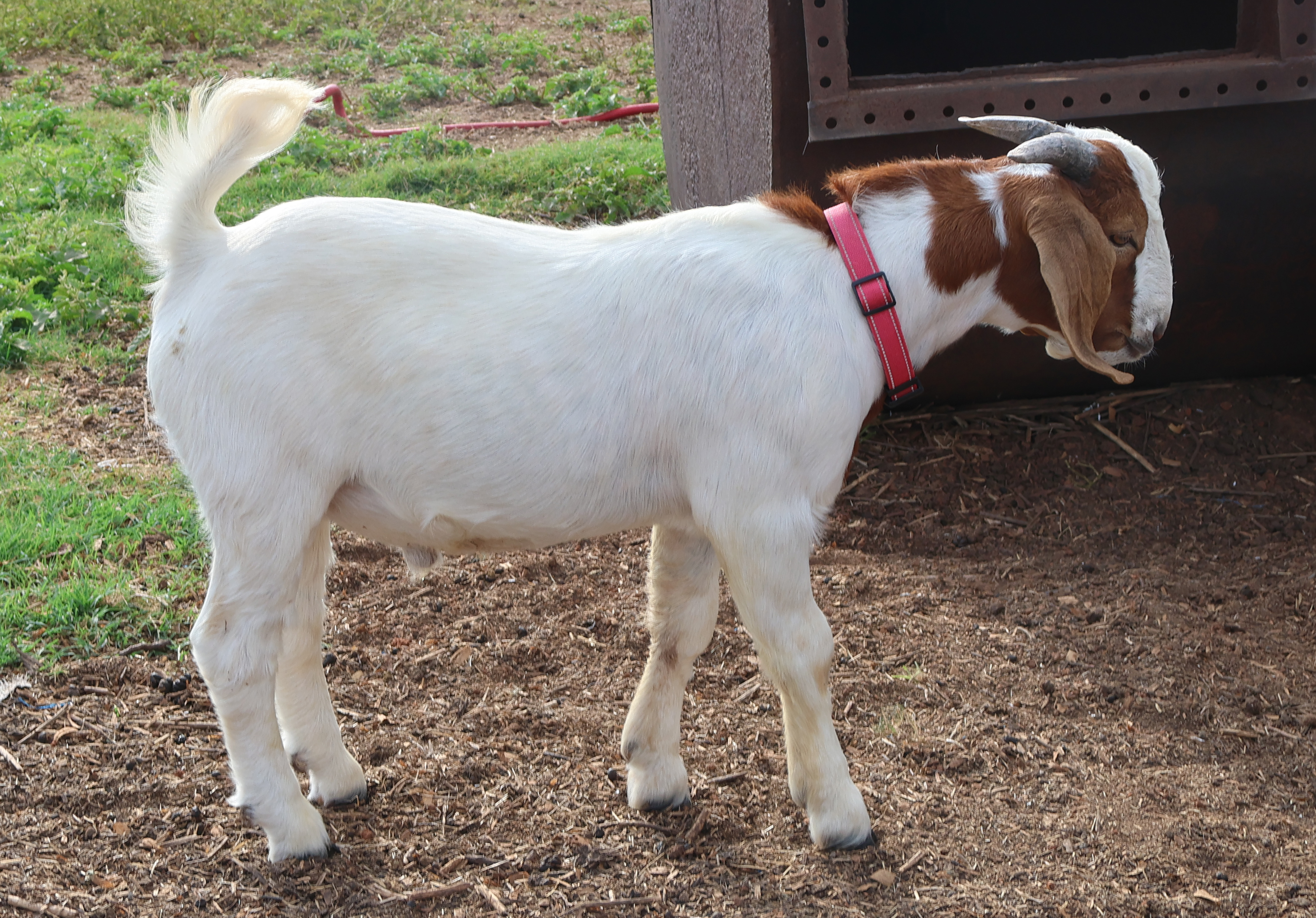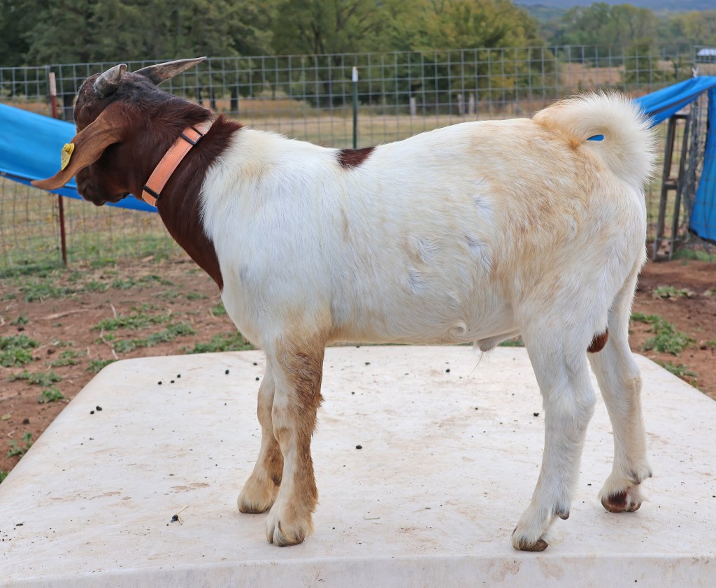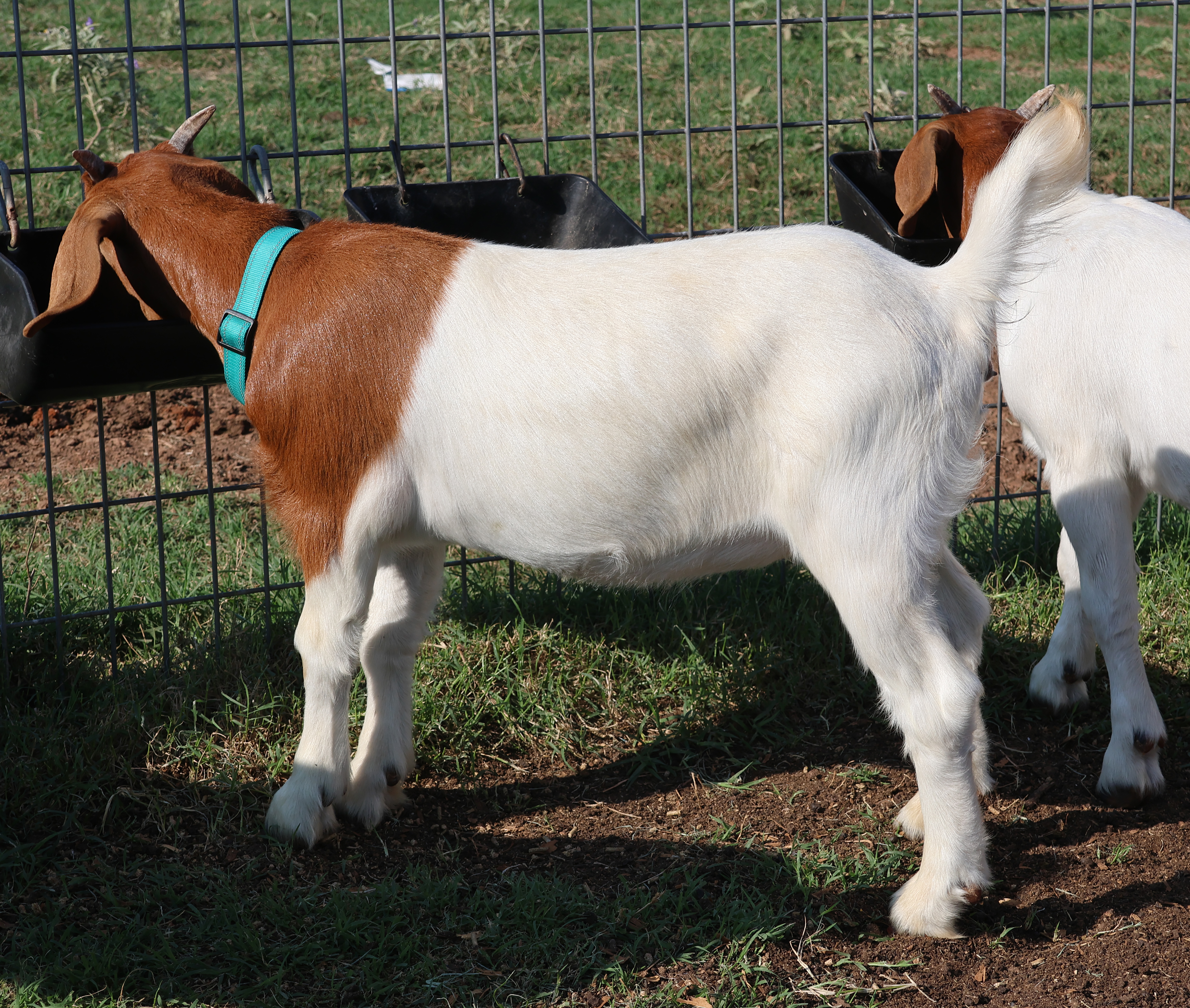 You won’t find a wether-bred buck for a more reasonable price. Schroeder was born April 6, 2024, and is out of a son of Kester-bred Hot Wheels (a son of Draggin’ Main), who has produced numerous champions for Irick Show Goats. Up-to-date on vaccinations. Schroeder’s estimated weight (via tape) on 10/7 was 84 lbs. Traditional color. Pigmented scrotum! Located northeast of Ada between Francis and Allen. Must pick up on the farm.