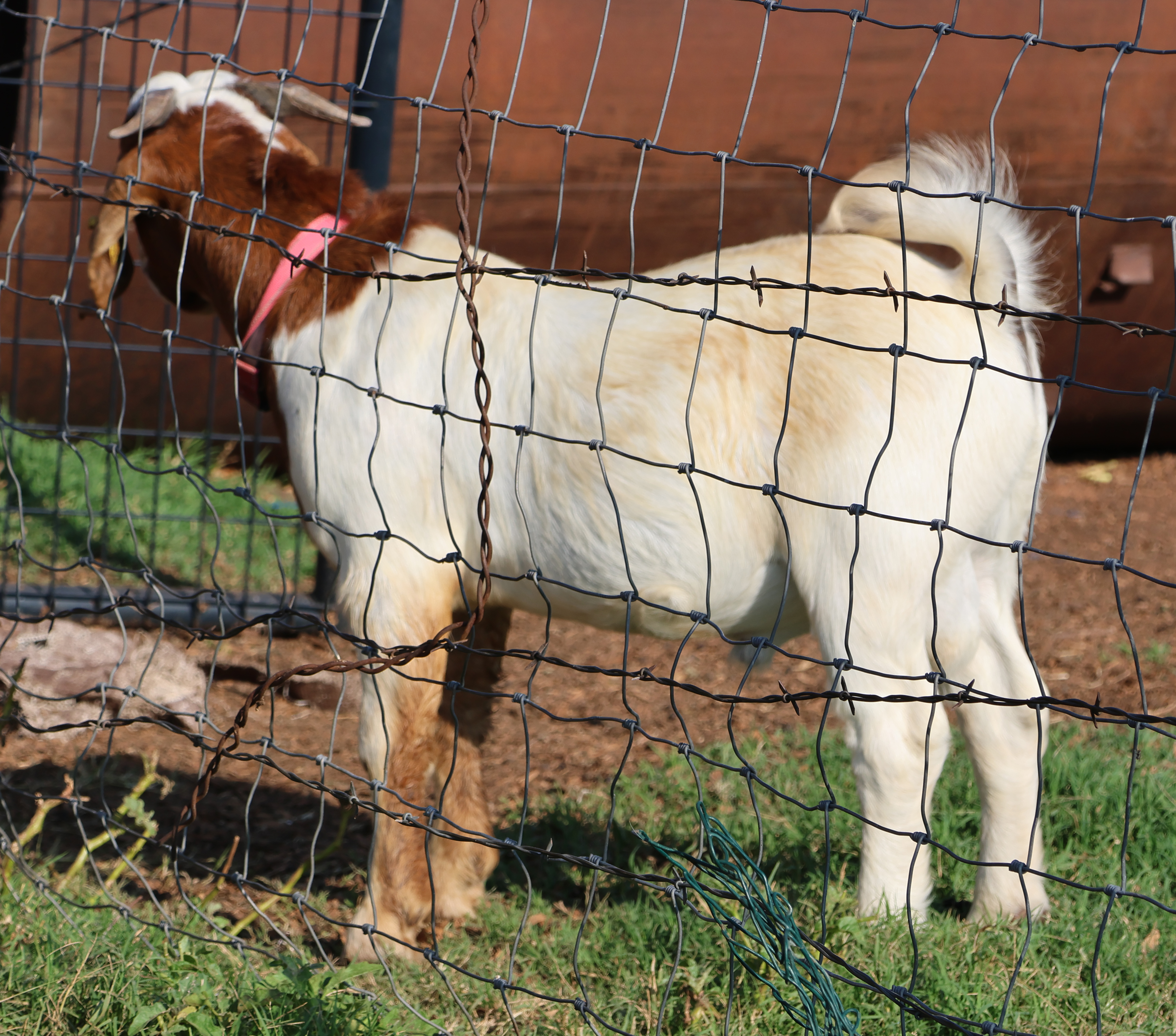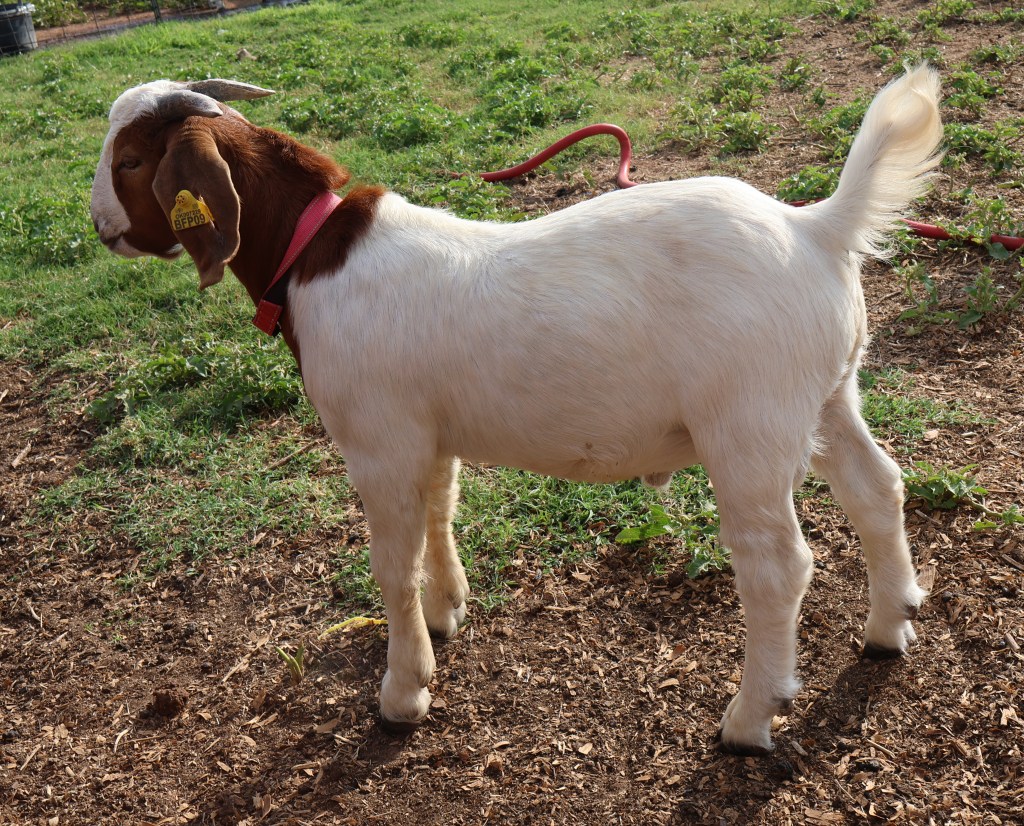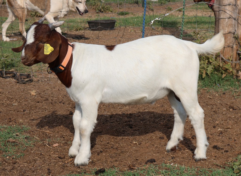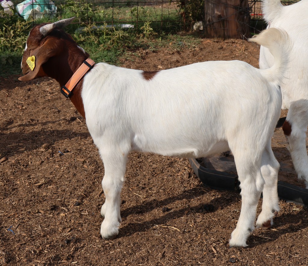 Wether-bred show doe prospect. Peanut was born Feb. 14, 2024, and is out of a son of Glen Martin’s $18,000 Eyes on Me buck x Turkey Creek doe. Peanut’s mom is a daughter of Kester-bred Hot Wheels (a son of Draggin’ Main), who has produced numerous champions for Irick Show Goats.Up-to-date on vaccinations. Peanut’s estimated weight (via tape) on 8/31 was 54 lbs. Her mom got puny before Peanut was weaned so she was a little behind her peers when mom’s milk dried up, but is really coming on now. Traditional color. Located northeast of Ada between Francis and Allen. Must pick up on the farm.