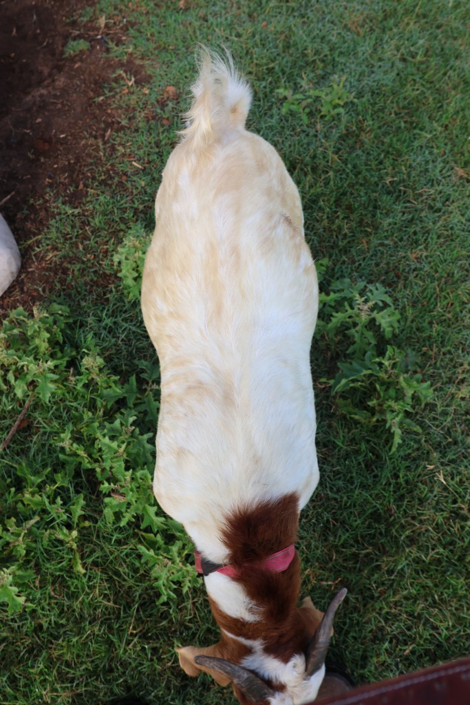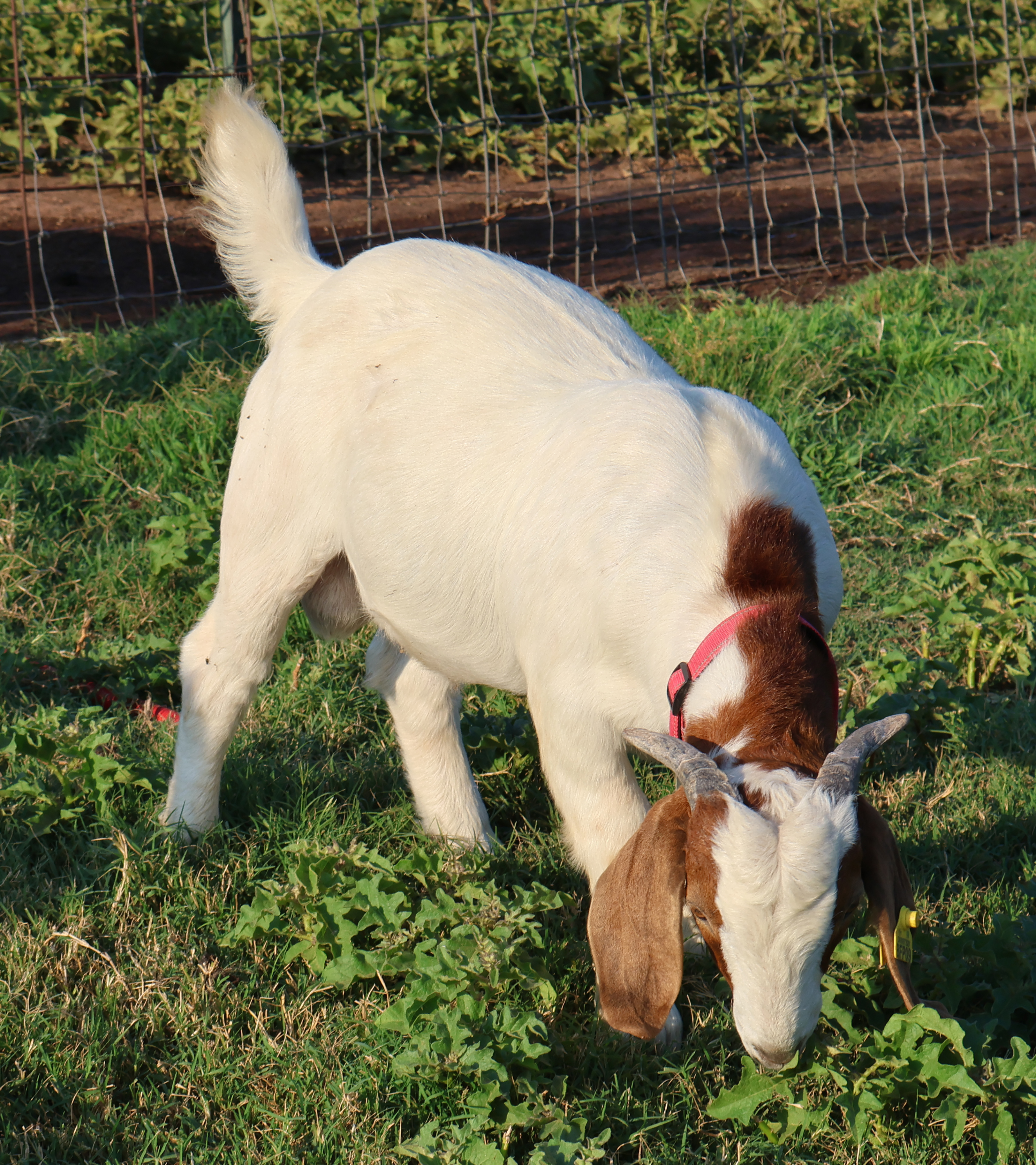 Snoopy is wether-bred, but would work in meat goat operations, too. He’s out of out of a son of Kester-bred Hot Wheels (a son of Draggin’ Main), who has produced numerous champions for Irick Show Goats. Up-to-date on vaccinations. Snoopy’s estimated weight (via tape) on 10/7 was 93 lbs. Traditional color. He had coccidiosis this summer and was set back and his price is reduced to reflect that. His twin brother sold for $750. Get the genetics without the price tag. Located northeast of Ada between Francis and Allen. Must pick up on the farm.
